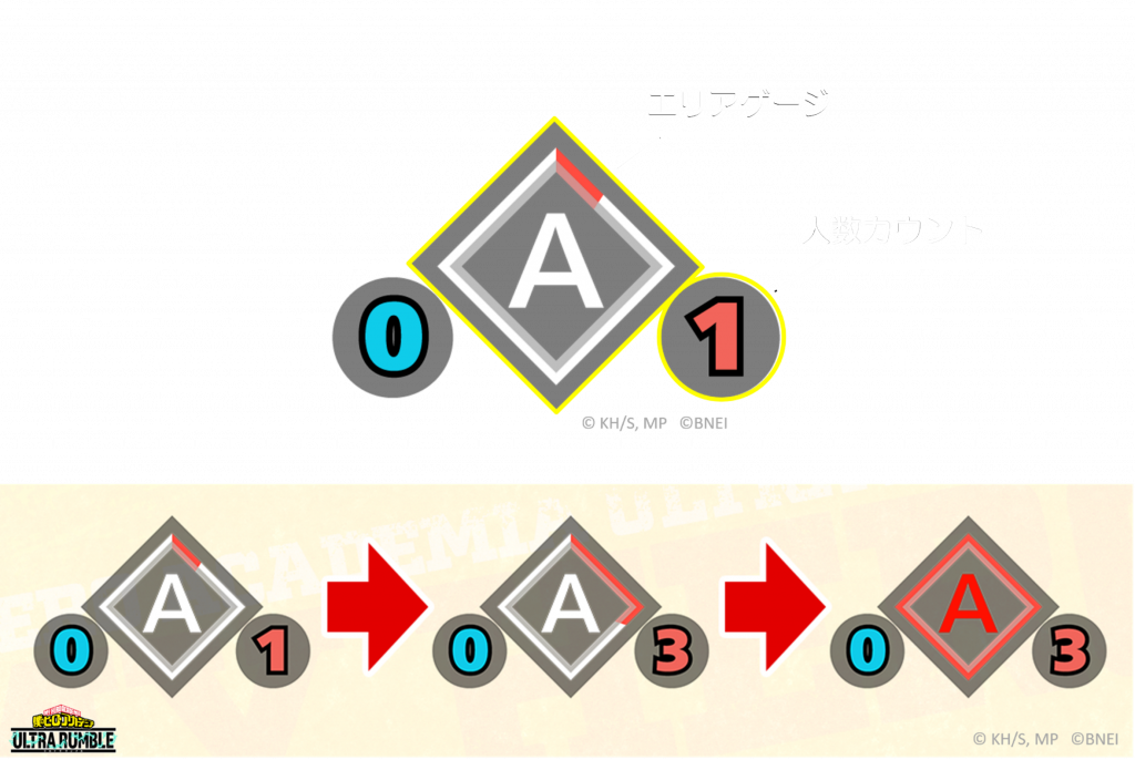 エリアに入ると、画面上部にあるエリアゲージが進行します。MAXまで溜めることで、そのエリアを確保することができます!エリア内の味方の人数が多いほど、ゲージが溜まる速度があがり、素早くエリアを確保することが可能になります。
