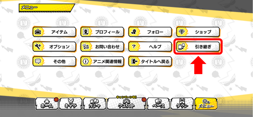 2.メニュー画面右側の「引き継ぎ」をタップ